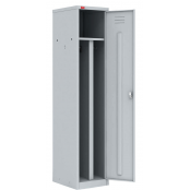 Шкаф разборный металлический односекционный с двумя отделениями, для хранения сменной одежды. Шкаф снабжен дверью с врезным замком, полкой под головной убор, в отделении перекладина для вешалки и крючки для одежды. Полимерное порошковое покрытие светло-серого цвета (RAL 7035).
