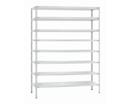 Размеры внешние. мм (ВхШхГ): 1800x 1000x 300 Количество полок: 8 полок (ярусов) Конструкция: Сборно-разборная Цвет: Светло-серый (RAL 7035) Тип покрытия: Порошково-полимерная краска